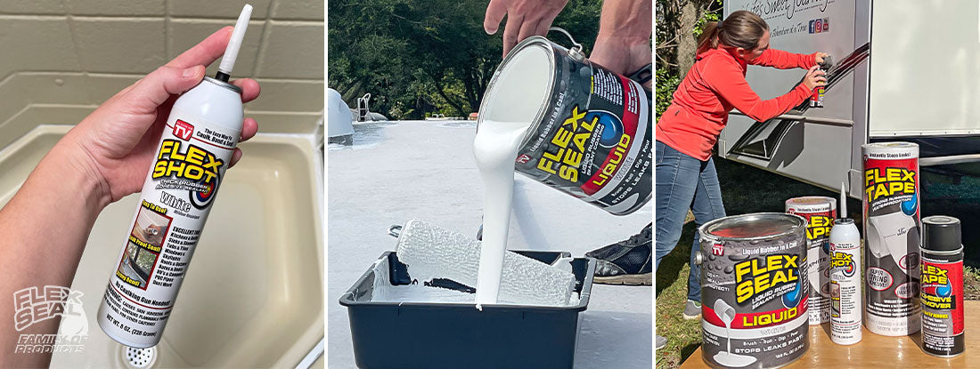 The video demonstrates using Flex Seal aerosol (black) to restore a rusty back bumper, making it look brand new by coating, protecting, and stopping rust bleed.