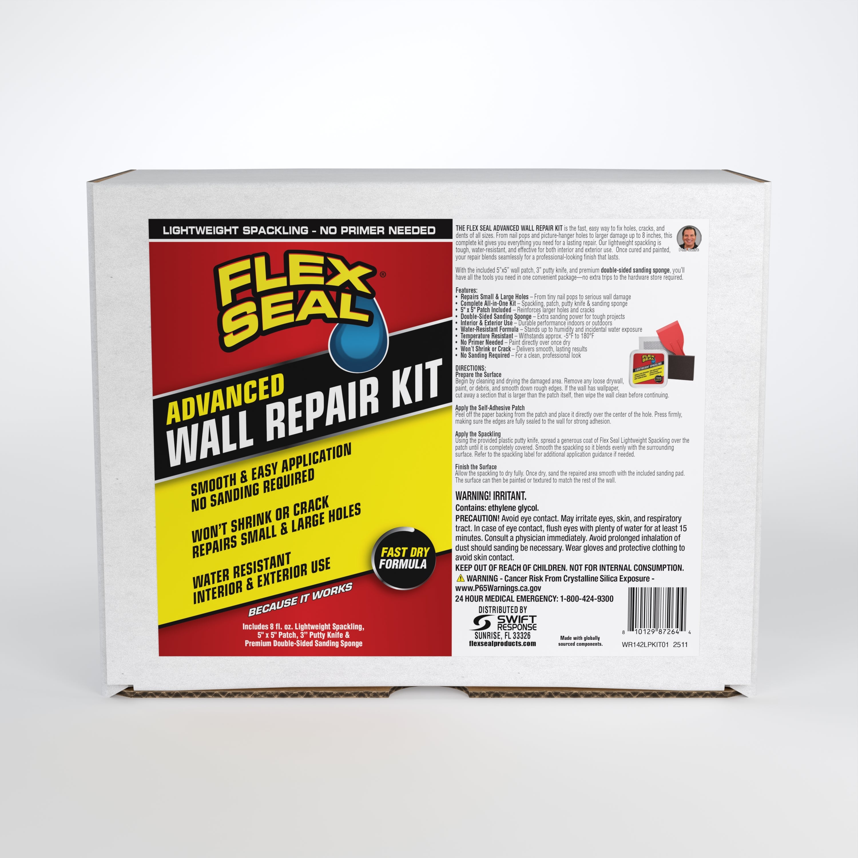 The Flex Seal® Wall Repair Kit is the fast, easy way to fix holes, cracks, and dents of all sizes. From nail pops and picture-hanger holes to larger damage, this complete all-in-one kit gives you everything you need for a lasting repair.