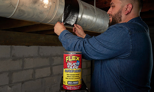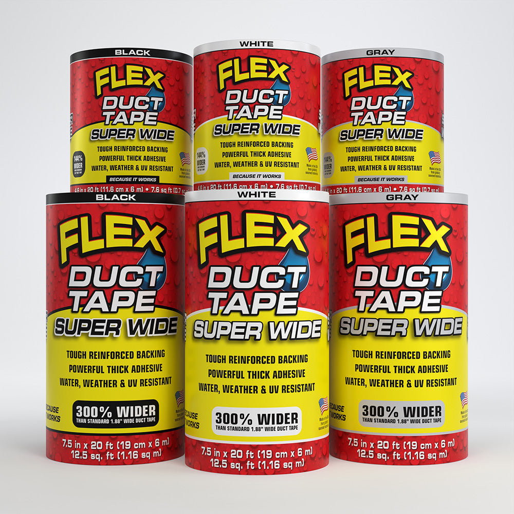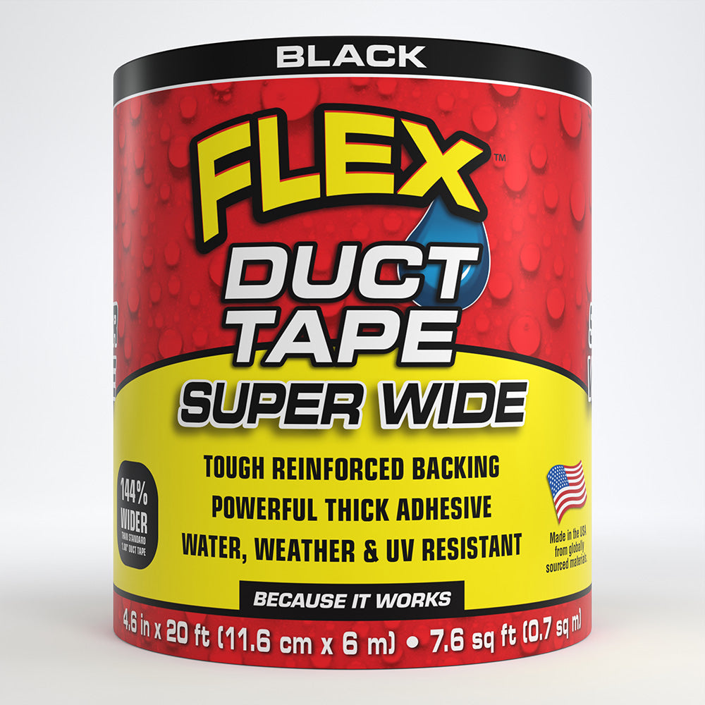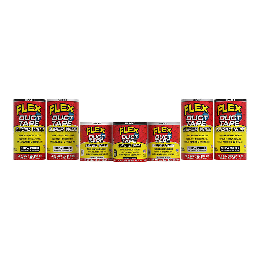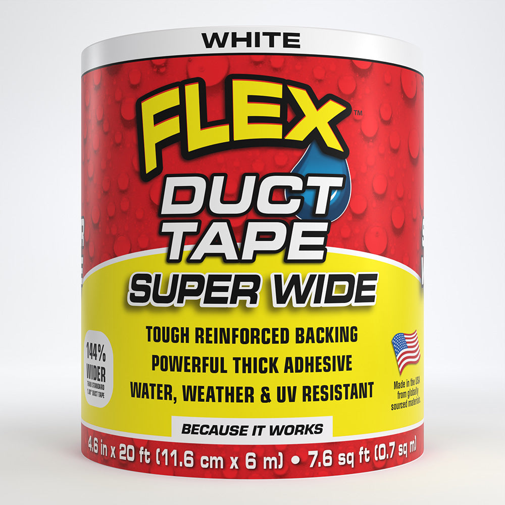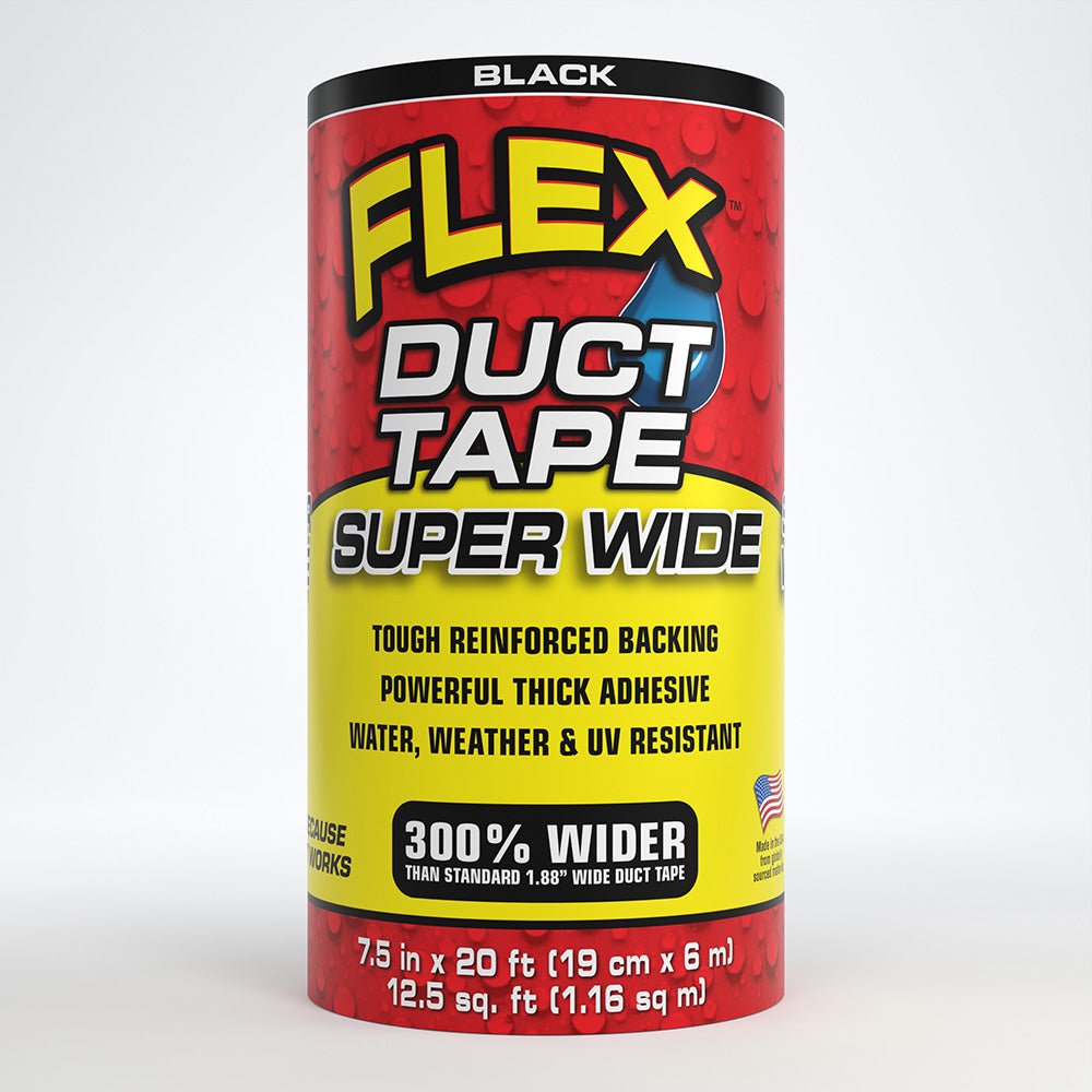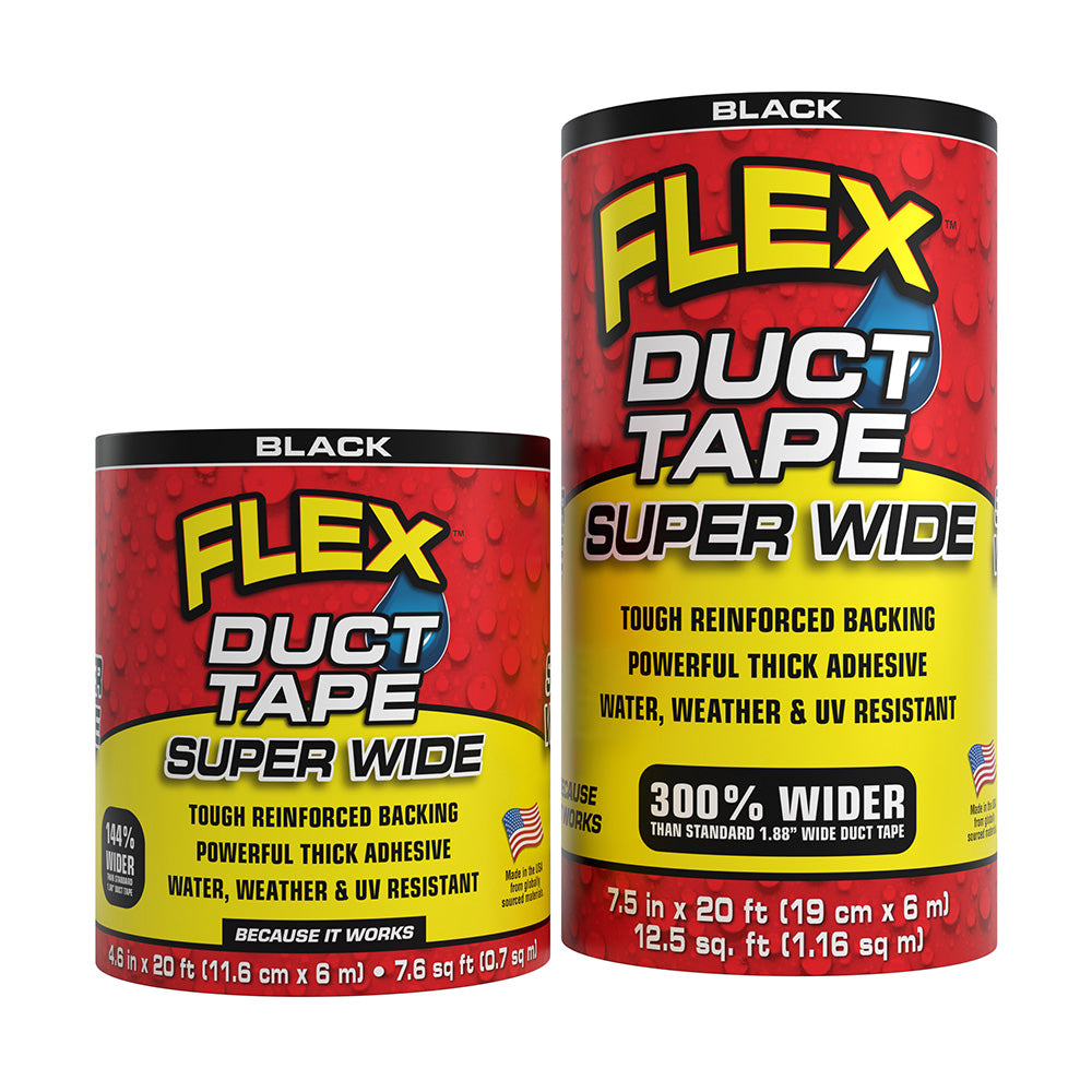 Flex Super Wide Duct Tape is removable, repositionable, and can be torn by hand (vertically and horizontally), so there’s no waste. Plus, it’s water**, weather, and UV resistant. It comes in a 7.5” size as well as a 4.6’’ size. Both are 20 ft long.