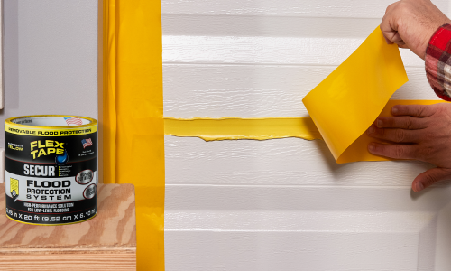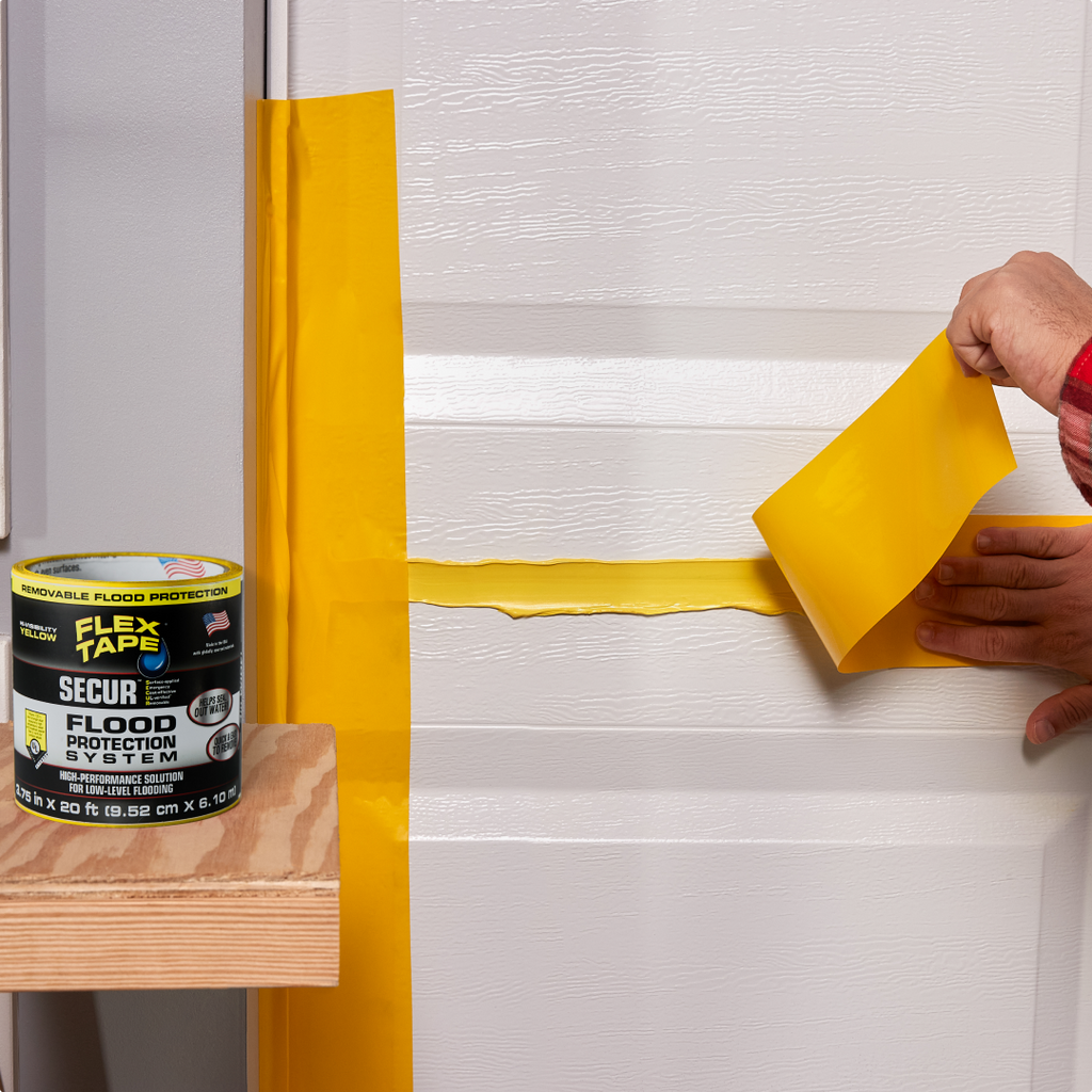 Flood Tape is a removable waterproof tape. It should only be applied to smooth, flat, even, nonporous surfaces and always be used in combination with other Flex Seal Flood Protection products. It comes extra wide to help seal large openings and can be used on both horizontal and vertical surfaces. Do not bend Flood Tape around corners or over irregular shapes. Flood Paste and/or Flood Liquid should be applied directly on top of the Flood Tape’s seams and edges.